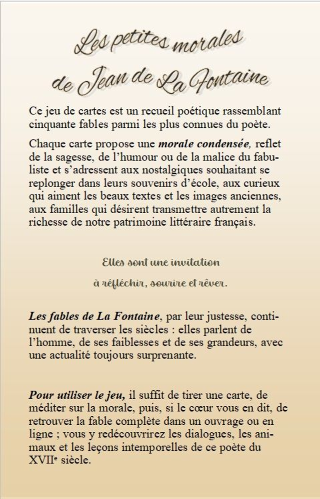 Ce jeu de cartes est un recueil poétique rassemblant cinquante illustrations de fables parmi les plus connues du poète.